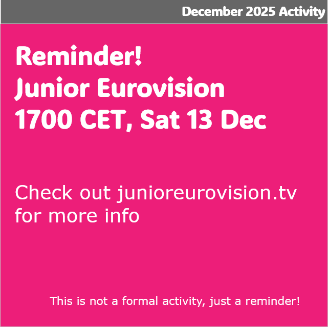 Following the Junior Eurovision, vote for your favourites, in the current Eurovision style of voting (12, 10, 8-1). We will announce the choice of our membership next month.